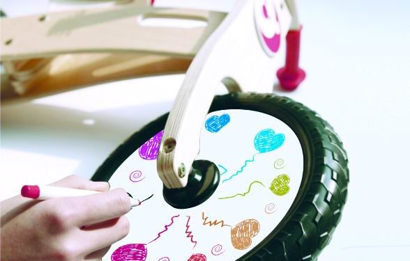 Teraz dzieci mogą samodzielnie pokolorować koła swojego rowerka. Zestaw zawiera specjalny mazak z gumką (w kolorze czarnym), którym można namalować wzorki na kołach, a następnie je zmazać. Można również użyć kolorowych mazaków i ozdobić...