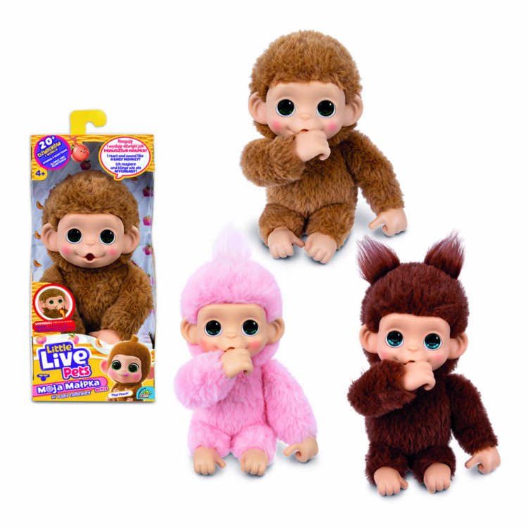 Moja Małpka Mini to mniejsza wersja kultowej interaktywnej małpki z serii Little Live Pets. Wygląda i zachowuje się jak prawdziwa małpka — ssie kciuk wydając przy tym dźwięki, reaguje na dotyk i uwielbia być głaskana. Budowa rączek i nóżek pozwala jej chwytać się różnych przedmiotów.