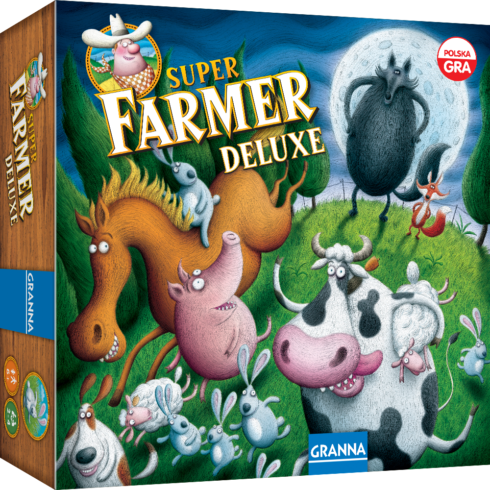 Superfarmer wraca w odświeżonej oprawie graficznej! Nowa edycja Deluxe kultowego polskiego superhitu Granny to ta sama ponadczasowa rozgrywka — zbierasz zwierzęta gospodarskie, rozwijasz hodowlę i zostajesz Superfarmerem — wzbogacona o nowe planszetki graczy i praktyczne tablice-ściągawki do przeliczania zwierząt. Gra w przystępny sposób uczy dodawania, mnożenia i zarządzania zasobami. Polska Gra.