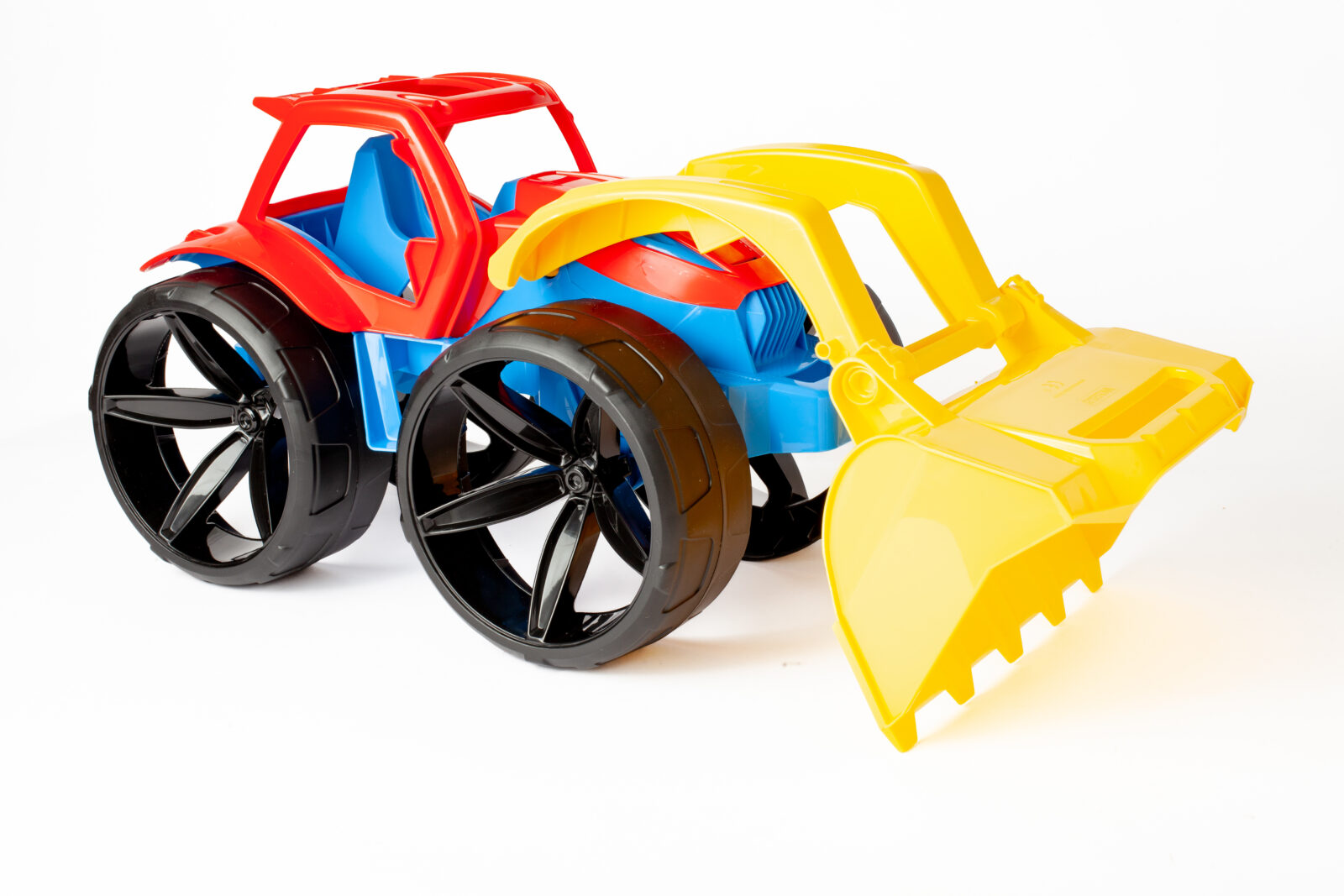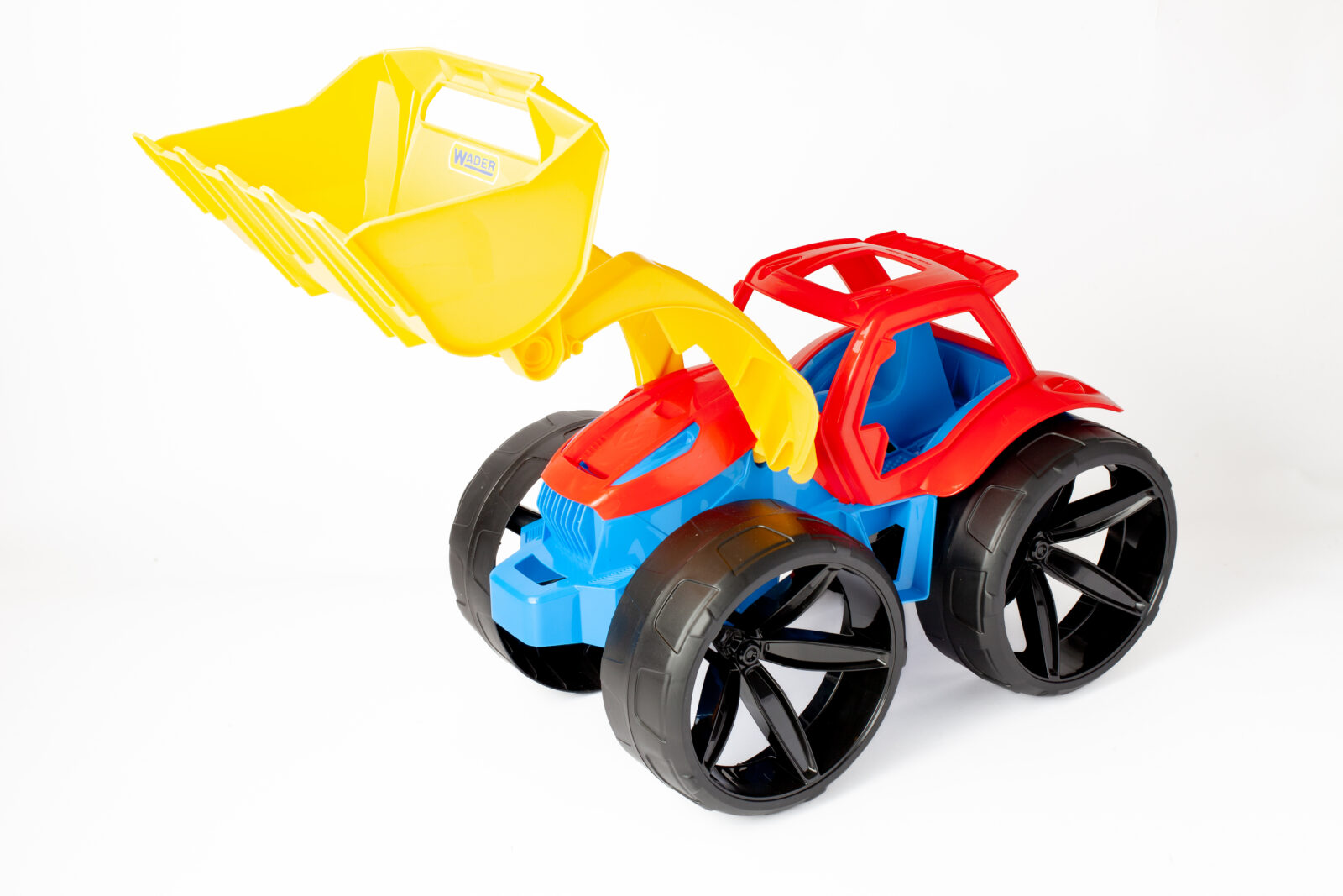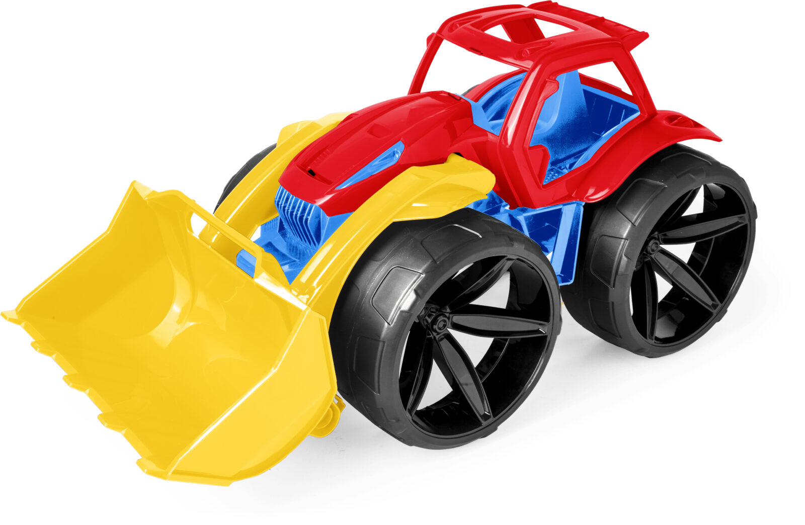 Maximus Spychacz w energetycznej kolorystyce czerwieni, granatu i żółci — duży, solidny pojazd z ruchomą łopatą którą dziecko może podnosić, opuszczać i używać do zgarniania materiałów. Mocne, stabilne koła zapewniają płynną jazdę po każdej nawierzchni. Długość pojazdu 68 cm.